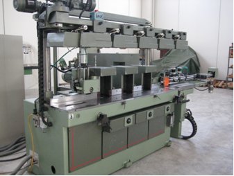 Инструментальный 12-ти станционный блок, содержащий сверла и агрегаты с угловыми контрприводами перфорации и фрезерования, электрошпиндель с соединением инструмента HSK 63 F с мощностью мотора 8 кВт и вариацией скорости вращения от мин. 900 до макс.13000 об/мин. за счет инвертера. Вертикальное перемещение (ось Z) при помощи двигателя Brushless и архимедова винта пониженного трения. Ось C: предназначена для всестороннего (360°) позиционирования агрегатов, головок, угловых контприводов и пр. устройств, соединенных с электрошпинделем при помощи быстрых соединений и фигурных штифтов. Движение выполняется при помощи сервопривода, расположенного по оси и прикреплепленного к эпициклоидному редуктору с пониженным зазором.