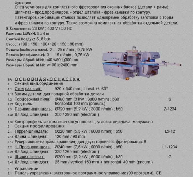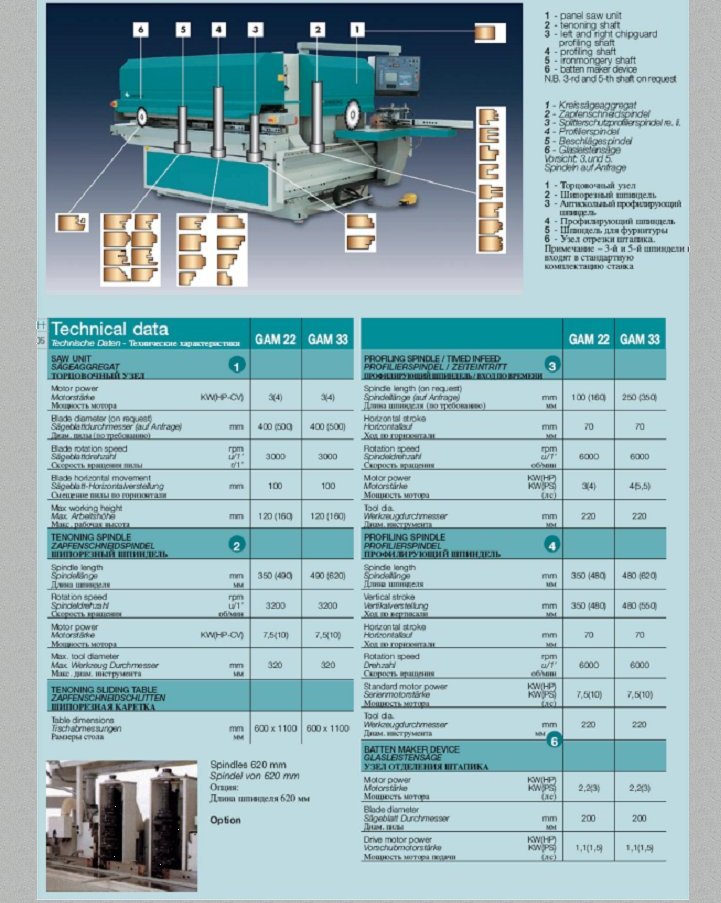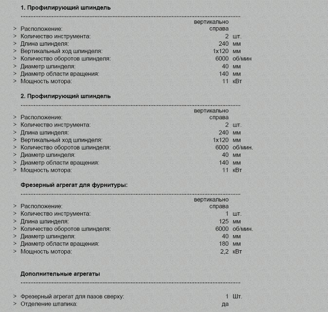 Вал диаметром 50 мм и длиной 320 мм с двигателем, мощностью 9 кВт со скоростью вращения 6000 об/мин, макс.диам.инструмента 240 мм, диаметр основания инструмента 110-140 мм, вертикальное перемещение, управляемое электронным процессором, автоматическое горизонтальное перемещение, управляемое выключателем вкл./выкл. (on/off), автоматический пуск «звездочка-треугольник». Вращение в двух направлениях при цикличной операции обработки для предотвращения скола в ходе операции обрамления первого профилирующего вала.