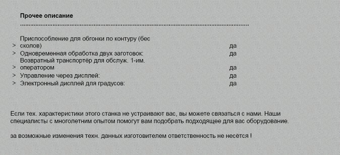 Рабочий стол размерами 720х1130мм, оснащён 2-мя пневматическими вертикальными прижимами элемента, автоматическим 4-х позиционным противоскольным устройством пневматического управления, контролируемым процессором. -----------------------------------------------------------------------------------------------------------------------------