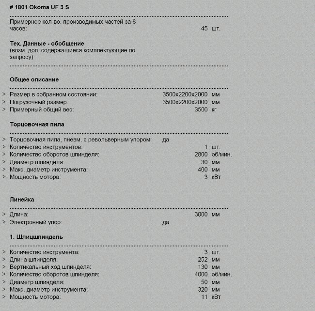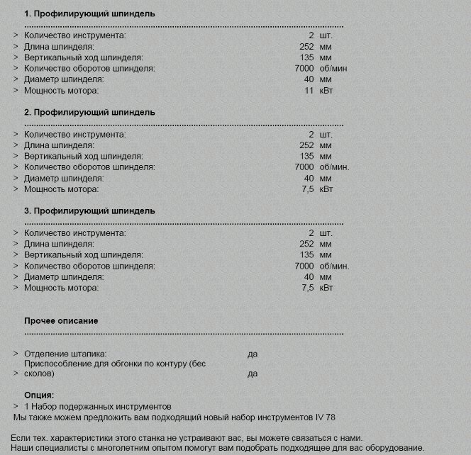 Вал диаметром 50 мм и длиной 320 мм, мощность двигателя от 9 кВт со скоростью вращения 3200 об/мин, макс. диам. инструмента 320 мм, вертикальное пневматическое перемещение в 4 позиции, каждая 80 мм, автоматический пуск «звездочка-треугольник».